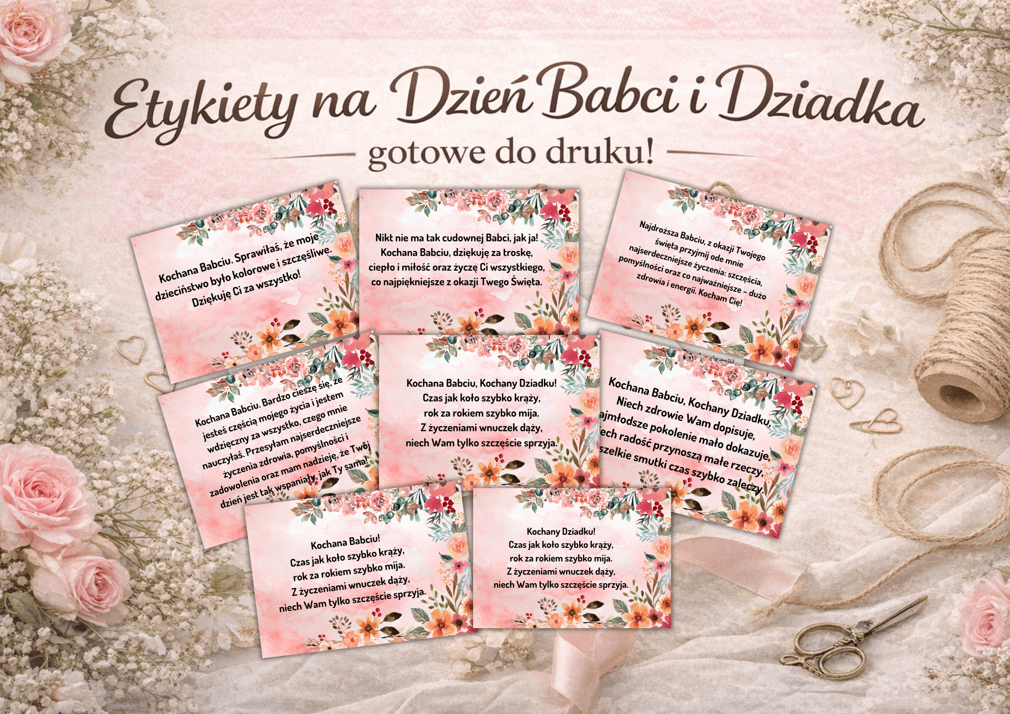 Subtelne etykiety z ciepłymi życzeniami dla Babci i Dziadka – idealne dołączone do prezentu, kwiatów, laurki lub upominku od serca.