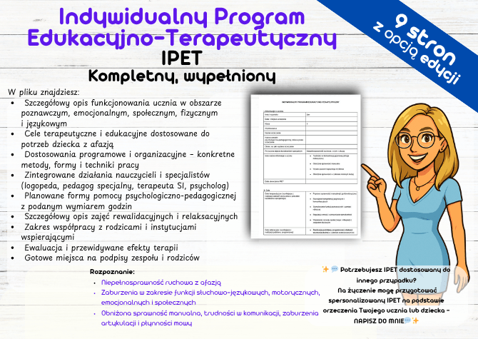 Szukasz gotowego IPET-u dla ucznia z niepełnosprawnością ruchową i trudnościami w mowie (afazją)? Ten dokument to praktyczne narzędzie dla nauczycieli, pedagogów i terapeutów – opracowany na podstawie realnego przypadku ucznia klasy I szkoły podstawowej, objętego kształceniem specjalnym.