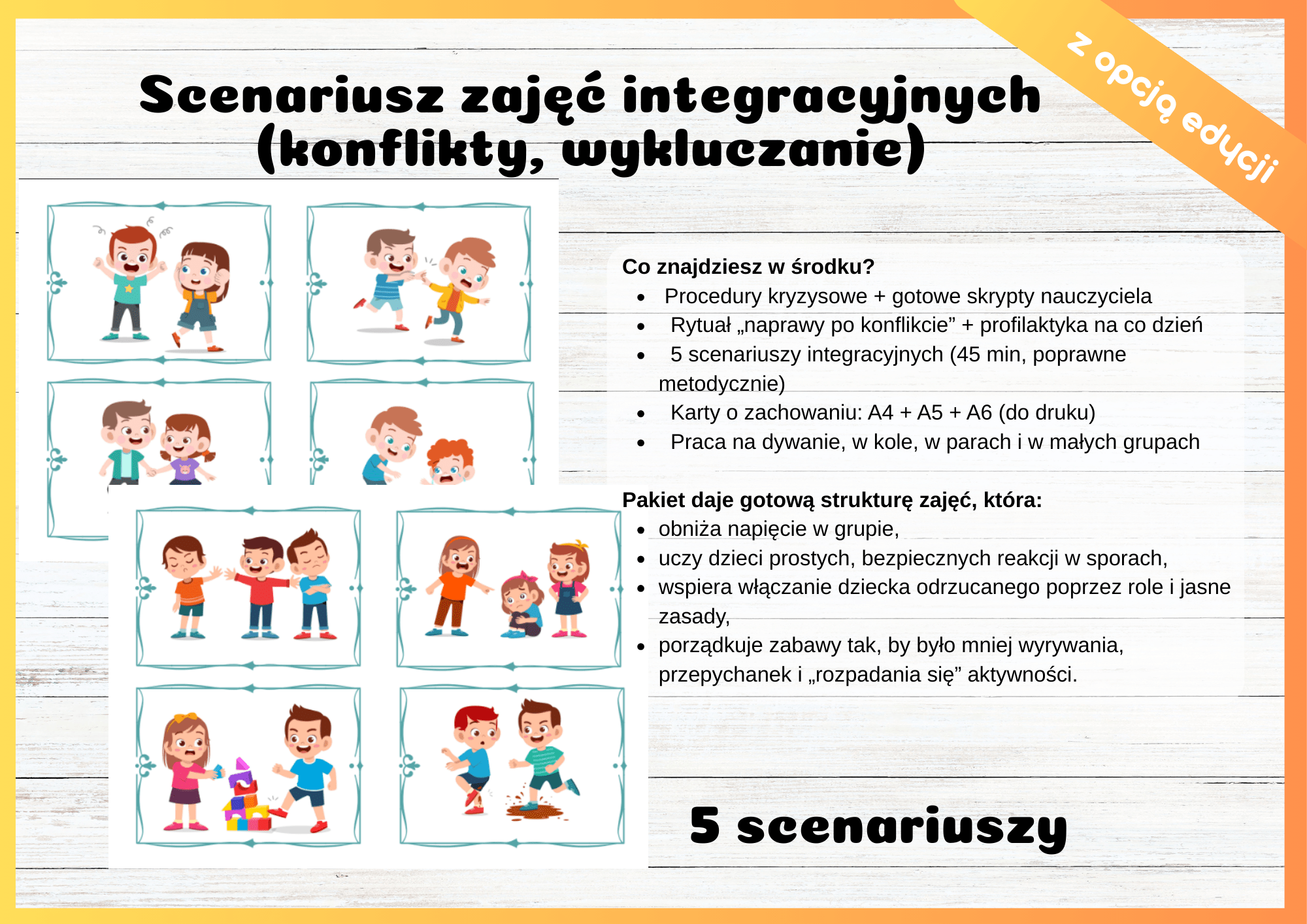 Ten pakiet został stworzony dokładnie na takie realne przedszkolne scenariusze – daje Ci konkret: co mówić i co robić w kryzysie oraz gotowe zajęcia integracyjne, które stopniowo zmieniają dynamikę grupy.