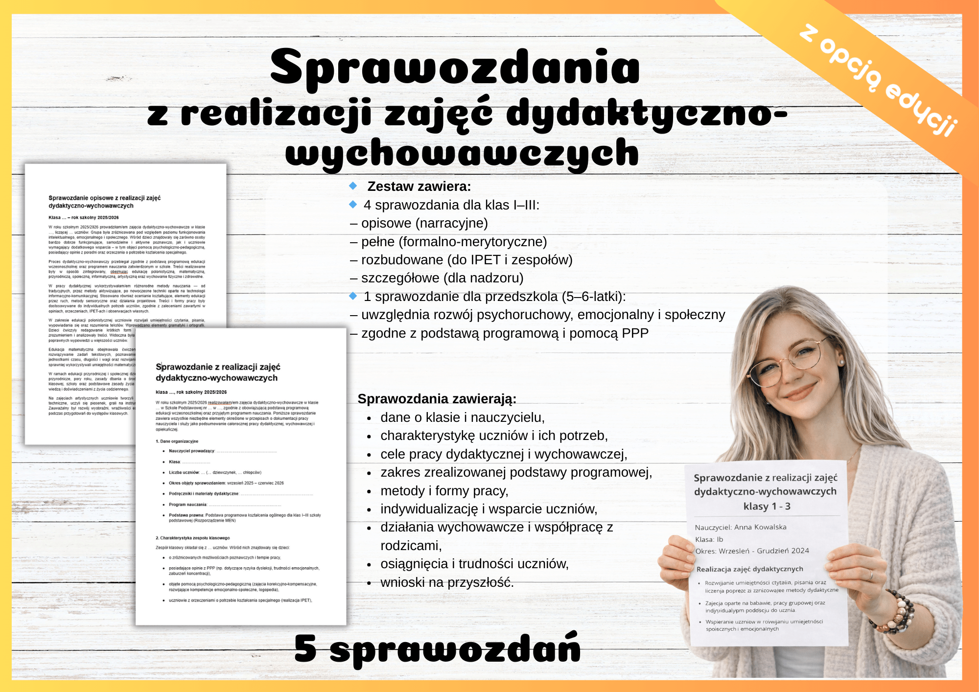 W pakiecie otrzymujesz 5 profesjonalnych sprawozdań z zajęć dydaktyczno‑wychowawczych dla klas I–III szkoły podstawowej.