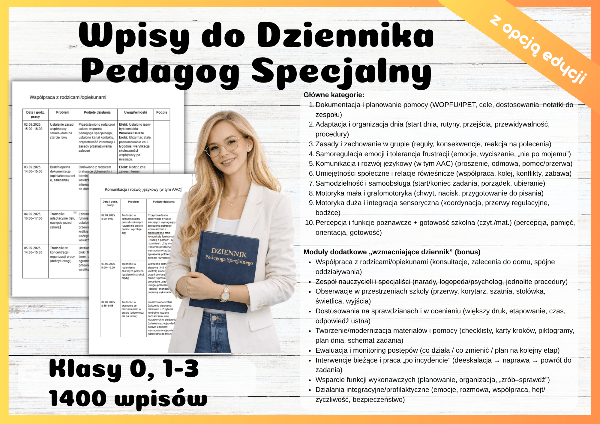 Gotowe wpisy do dziennika pedagoga specjalnego dla klasy 0 i klas 1–3. Pakiet oparty o 10 stałych kategorii (m.in. adaptacja, zachowanie, emocje, AAC, społeczne, motoryka, percepcja, gotowość szkolna) oraz dodatkowe moduły: współpraca z rodzicami, zespół specjalistów, obserwacje w przestrzeniach szkoły, dostosowania na sprawdzianach, materiały i checklisty, monitoring postępów, interwencje po incydentach, profilaktyka integracyjna. Wpisy w stylu Efekt–Wniosek–Dalsze kroki, gotowe do wklejenia.